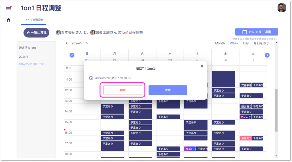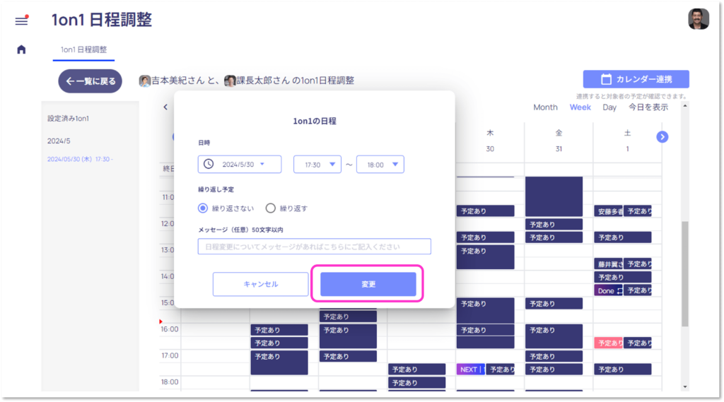 2-3. 変更したい1on1をクリックし、[変更]をクリックします。