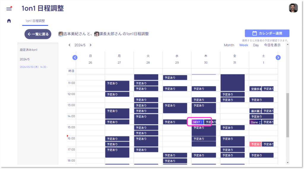 日程アシスタントは、日程調整対象者とそのペアのカレンダーを確認し1on1を設定できます。
