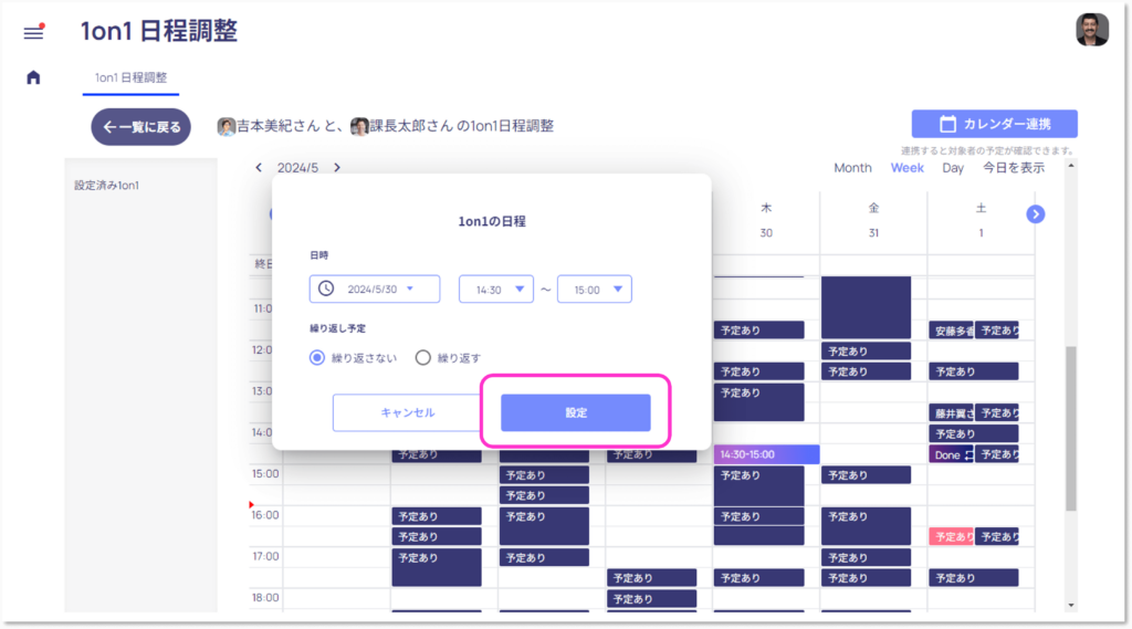 1-3. 1on1を設定したい日程をクリックし、1on1の日程、繰り返し設定の有無を選択し[設定]をクリックします。